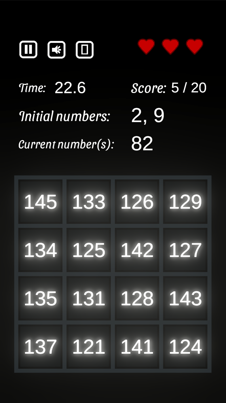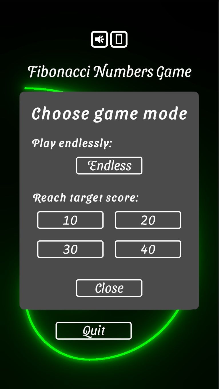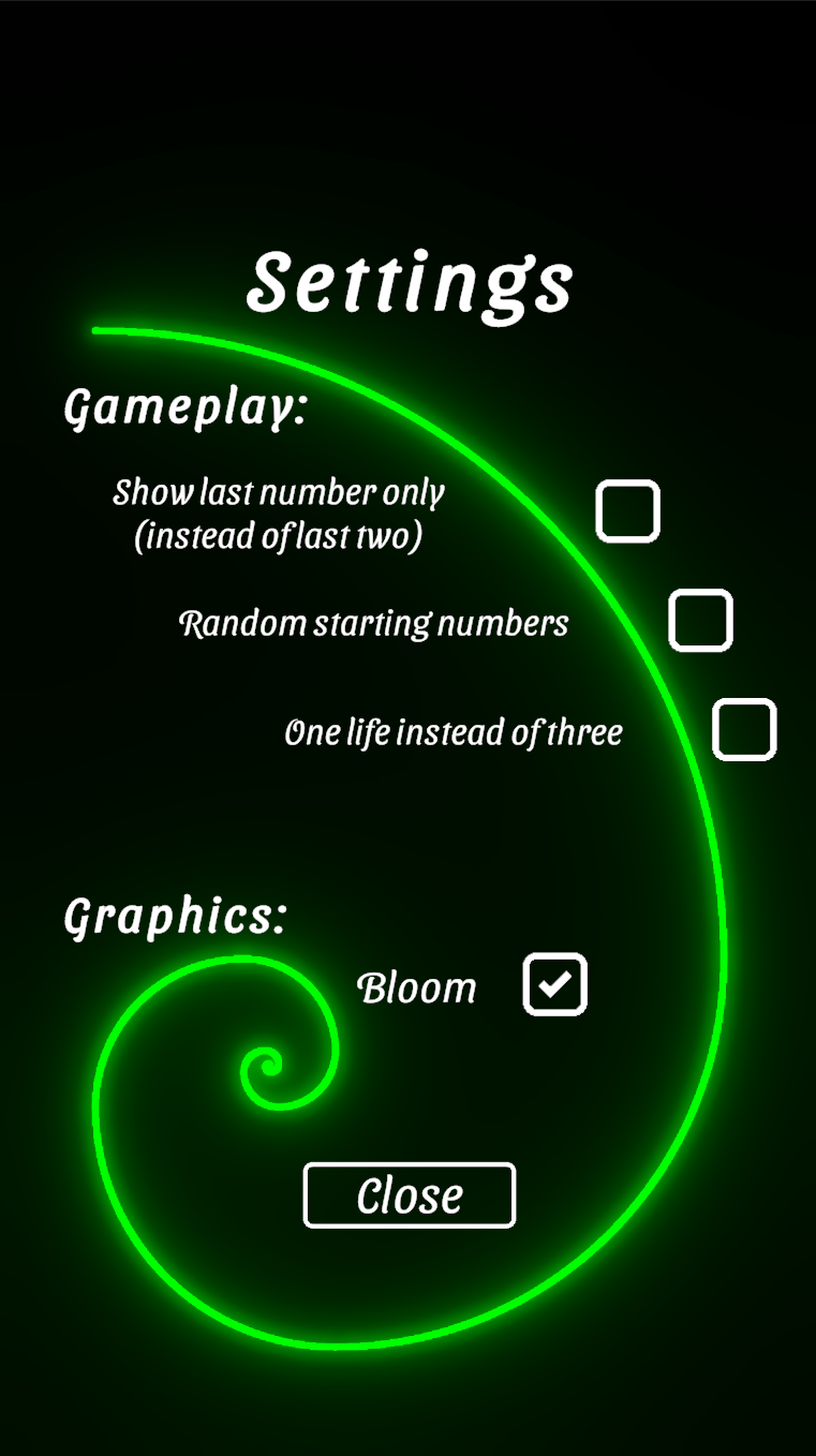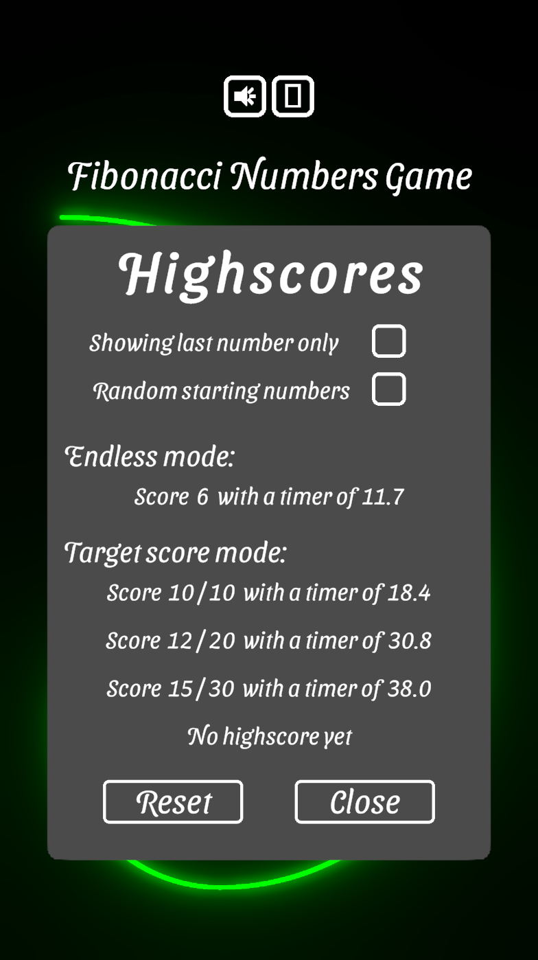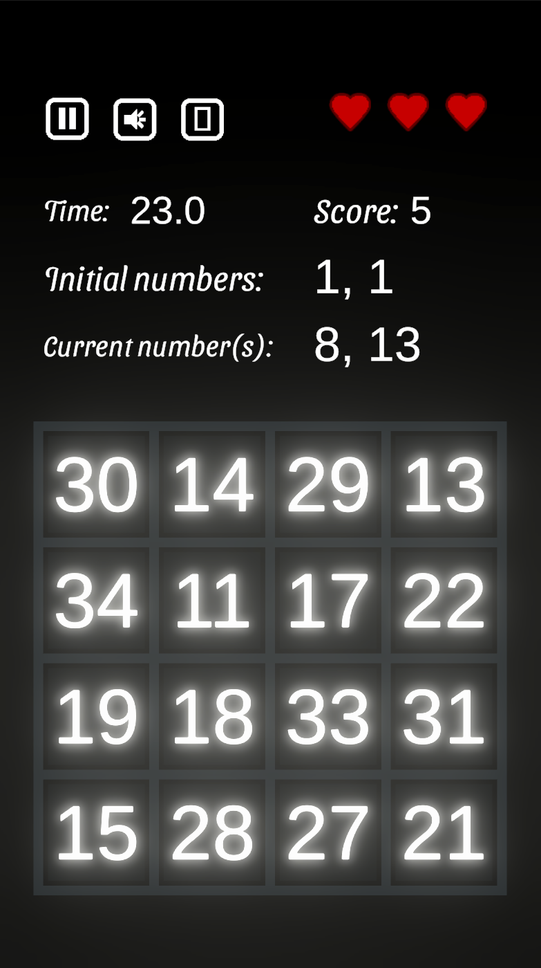 Starting with either 1 and 1, or two small random numbers, you have to choose the correct next Fibonacci number out of 16 possible answers. You can do this in endless mode, trying to maximize your score, or in target mode, trying to reach a score of 10, 20, 30 or 40 as fast as possible.